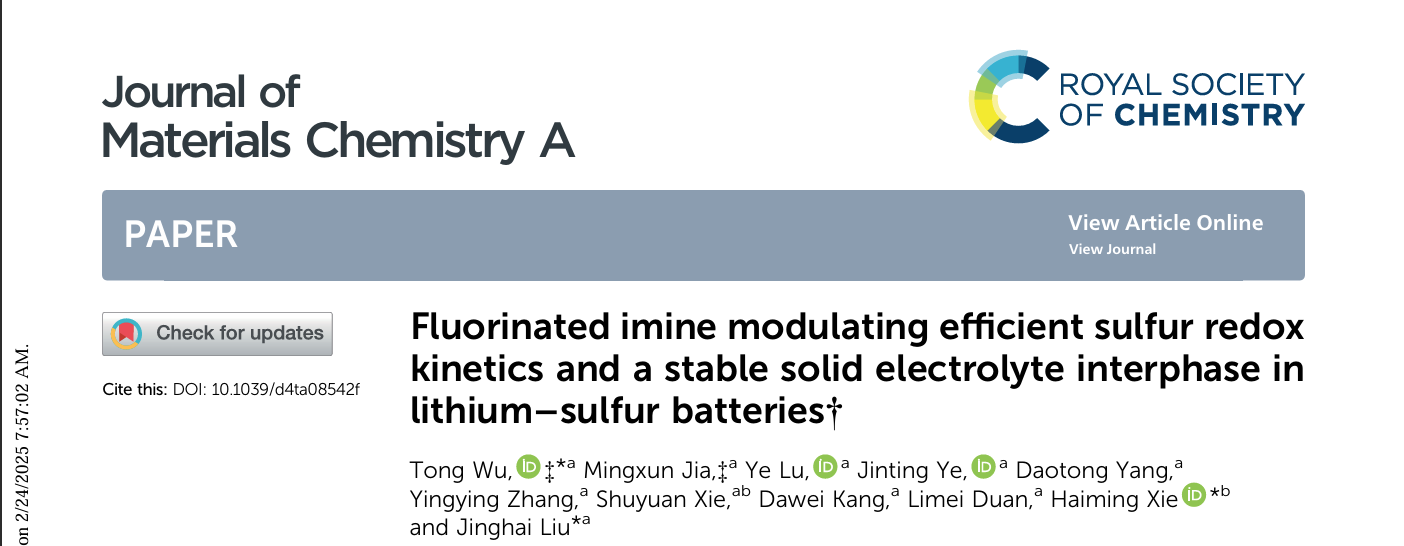 近日,我院教师吴桐在中科院二区TOP期刊《Journal of Materials Chemistry A》上发表题为”Fluorinated imine modulating efficient sulfur redox kinetics and a stable solid electrolyte interphase in lithium–sulfur batteries”的研究成果。教师吴桐和科研助理贾铭勋为第一作者,刘景海教授、吴桐老师和东北师范大学谢海明教授为共同通讯作者。